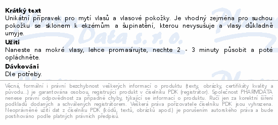 Unikátní přípravek pro mytí vlasů a vlasové pokožky. Je vhodný zejména pro suchou pokožku se sklonem k ekzémům a šupinatění, kterou nevysušuje a vlasy důkladně umyje.