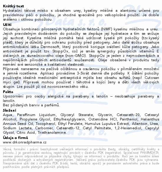 Hydratační tělové mléko s obsahem urey, kyseliny mléčné a alantoinu určené pro pravidelnou péči o pokožku, je vhodné speciálně pro velkoplošné použití. Je dobře snášeno i citlivou pokožkou.