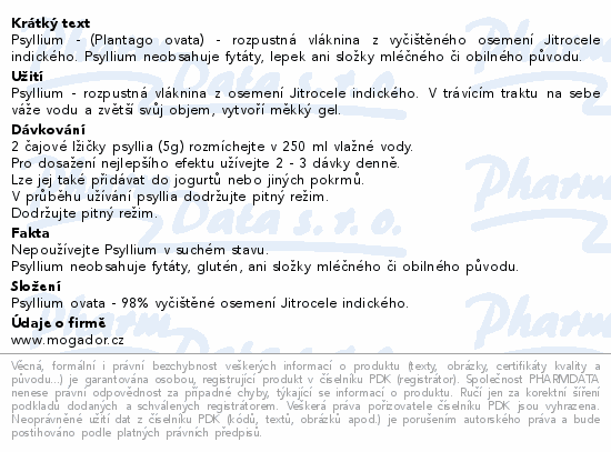Psyllium - (Plantago ovata) - rozpustná vláknina z vyčištěného osemení Jitrocele indického. Psyllium neobsahuje fytáty, lepek ani složky mléčného či obilného původu.