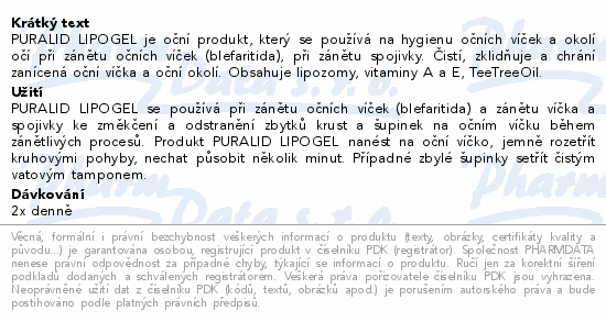 PURALID LIPOGEL je oční produkt, který se používá na hygienu očních víček a okolí očí při zánětu očních víček (blefaritida), při zánětu spojivky. Čistí, zklidňuje a chrání zanícená oční víčka a oční okolí. Obsahuje lipozomy, vitaminy A a E, TeeTreeOil.