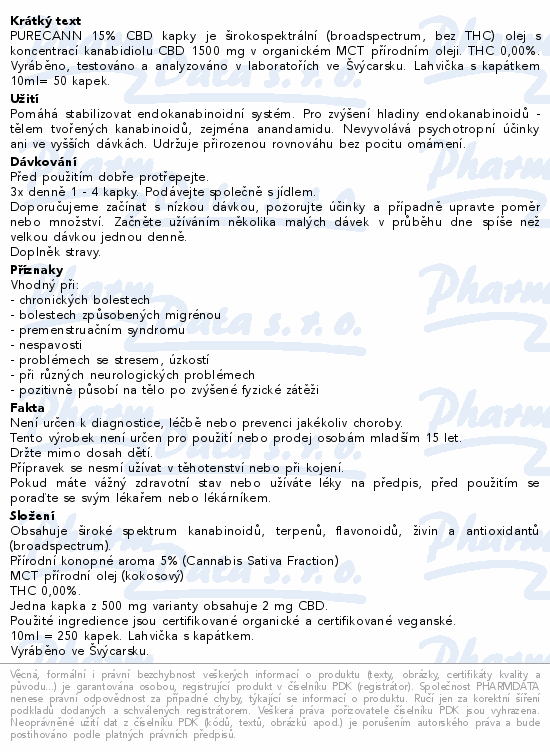 PURECANN 15% CBD kapky je širokospektrální (broadspectrum, bez THC) olej s koncentrací kanabidiolu CBD 1500 mg v organickém MCT přírodním oleji. THC 0,00%. Vyráběno, testováno a analyzováno v laboratořích ve Švýcarsku. Lahvička s kapátkem 10ml= 50 kapek.