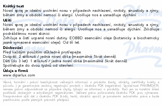 Nosní sprej je ideální uvolnění nosu v případech nachlazení, rinitidy, sinusitidy a rýmy, během zimy a období nemocí či alergií. Uvolňuje nos a usnadňuje dýchání.