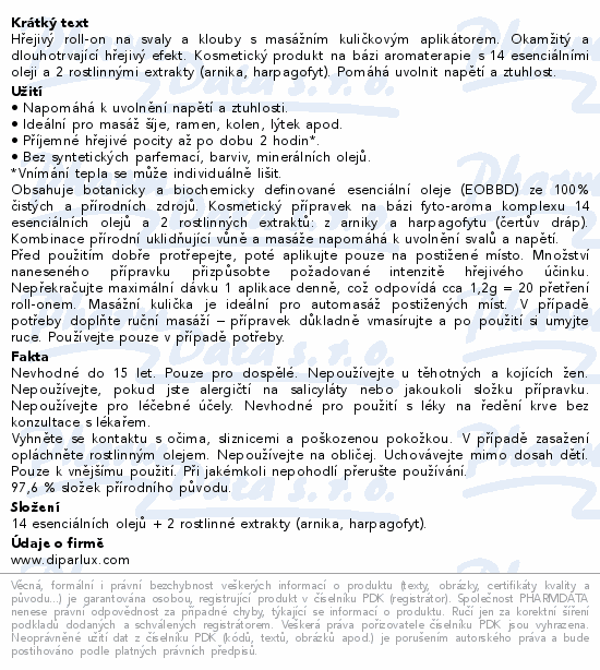 Hřejivý roll-on na svaly a klouby s masážním kuličkovým aplikátorem. Okamžitý a dlouhotrvající hřejivý efekt. Kosmetický produkt na bázi aromaterapie s 14 esenciálními oleji a 2 rostlinnými extrakty (arnika, harpagofyt). Pomáhá uvolnit napětí a ztuhlost.