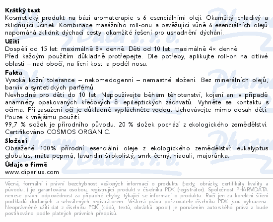 Kosmetický produkt na bázi aromaterapie s 6 esenciálními oleji. Okamžitý chladivý a zklidňující účinek. Kombinace masážního roll-onu a osvěžující vůně 6 esenciálních olejů napomáhá zklidnit dýchací cesty: okamžité řešení pro usnadnění dýchání.