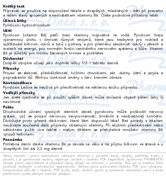 | Farmako-terapeutická skupina, účinné látky: | TRÁVICÍ TRAKT A METABOLISMUS -> VITAMINY -> JINÉ VITAMINOVÉ PŘÍPRAVKY (NEKOMBINOVANÉ) -> JINÉ VITAMINOVÉ PŘÍPRAVKY (NEKOMBINOVANÉ) -> PYRIDOXIN (VITAMIN B6) |