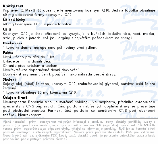 Přípravek Q Max® 60 obsahuje fermentovaný koenzym Q10. Jediná tobolka obsahuje 60 mg oxidované formy koenzymu Q10.