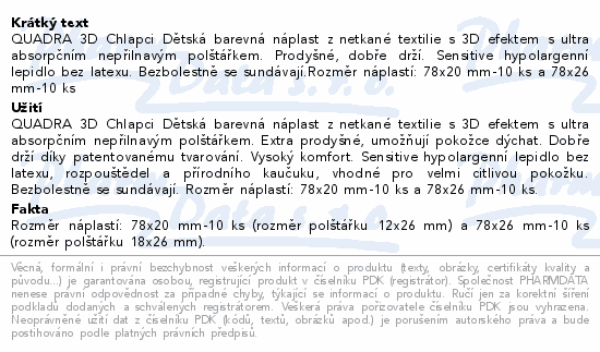 QUADRA 3D Chlapci Dětská barevná náplast z netkané textilie s 3D efektem s ultra absorpčním nepřilnavým polštářkem. Prodyšné, dobře drží. Sensitive hypolargenní lepidlo bez latexu. Bezbolestně se sundávají.Rozměr náplastí: 78x20 mm-10 ks a 78x26 mm-10 ks