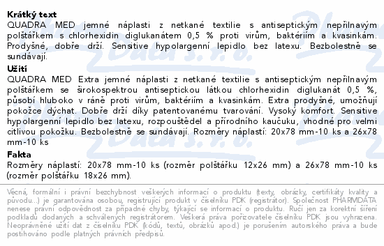 QUADRA MED jemné náplasti z netkané textilie s antiseptickým nepřilnavým polštářkem s chlorhexidin diglukanátem 0,5 % proti virům, baktériím a kvasinkám. Prodyšné, dobře drží. Sensitive hypolargenní lepidlo bez latexu. Bezbolestně se sundávají.