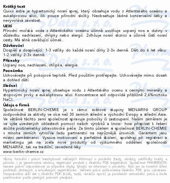 Quixx extra je hypertonický nosní sprej, který obsahuje vodu z Atlantského oceánu a eukaliprovou silici, čili pouze přírodní složky. Neobsahuje žádné konzervační látky a nevyvolává závislost.