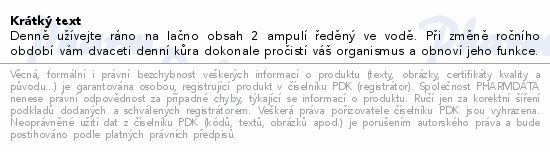 Denně užívejte ráno na lačno obsah 2 ampulí ředěný ve vodě. Při změně ročního období vám dvaceti denní kůra dokonale pročistí váš organismus a obnoví jeho funkce.