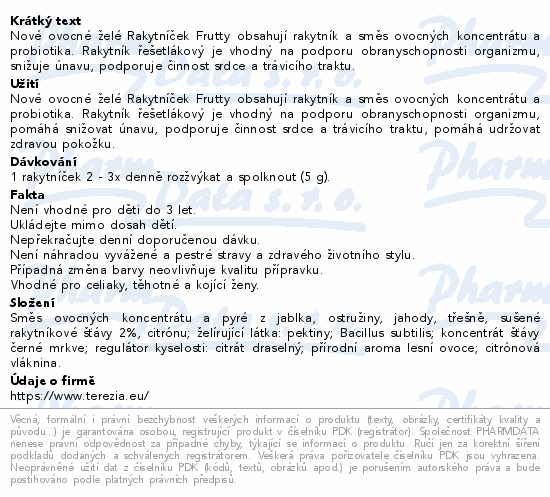Nové ovocné želé RAKYTNÍČEK FRUTTY s 95 % ovoce si zamilují všechny děti. Obsahují rakytník a směs ovocných koncentrátů a důležitá probiotika. Rakytník je naší stálicí, proto nesměl chybět ani zde. Rakytník podporuje obranyschopnost organizmu, pomáhá snižovat únavu, podporuje činnost srdce a trávicího traktu, a v neposlední řadě pomáhá udržovat zdravou pokožku.