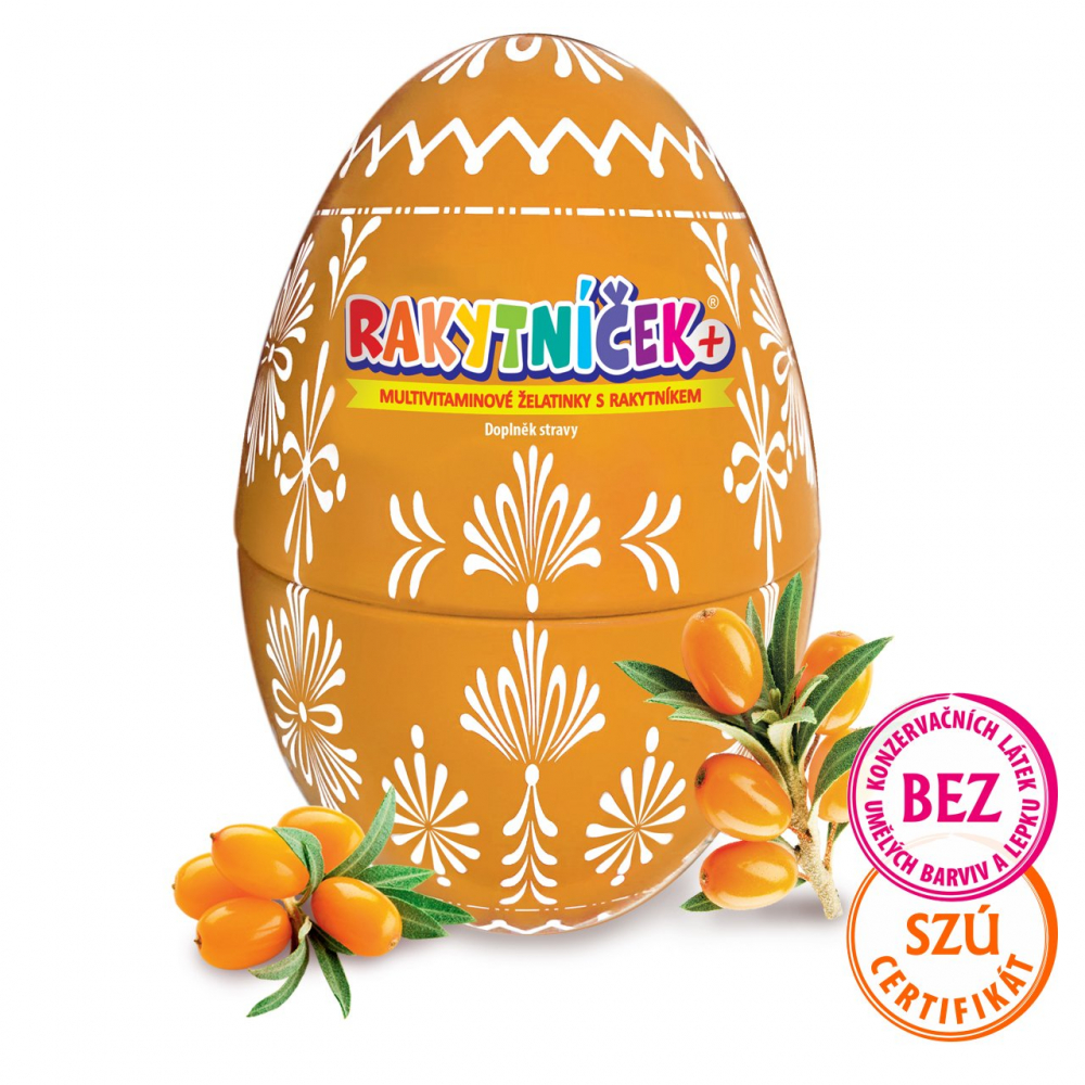 RAKYTNÍČEK želatinky je doplněk stravy obsahující rakytník a směs ovocných koncentrátů a vitaminy. Obsahuje 20% ovocné šťávy a 9 vitaminu. Vhodné pro celiaky, těhotné a kojící ženy. Varianta se zeleným vejcem.