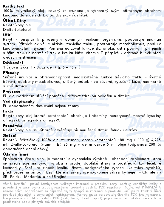 100% rakytníkový olej lisovaný za studena je významný svým přirozeným obsahem karotenoidů a dalších biologicky aktivních látek.