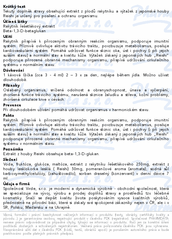 Tekutý doplněk stravy obsahující extrakt z plodů rakytníku a výtažek z japonské houby Reishi je určený pro posílení a ochranu organismu.