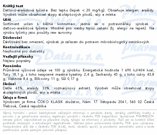 Datlovo-arašídová tyčinka. Bez lepku (lepek < 20 mg/kg). Obsahuje alergen: arašídy. Výrobek může obsahovat stopy skořápkových plodů, sóji a mléka.