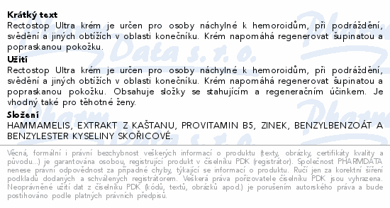 Rectostop Ultra krém je určen pro osoby náchylné k hemoroidům, při podráždění, svědění a jiných obtížích v oblasti konečníku. Krém napomáhá regenerovat šupinatou a popraskanou pokožku.