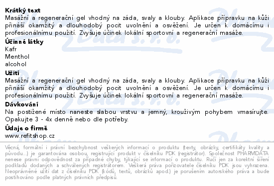 Masážní a regenerační gel vhodný na záda, svaly a klouby. Aplikace přípravku na kůži přináší okamžitý a dlouhodobý pocit uvolnění a osvěžení. Je určen k domácímu i profesionálnímu použití. Zvyšuje účinek lokální sportovní a regenerační masáže.