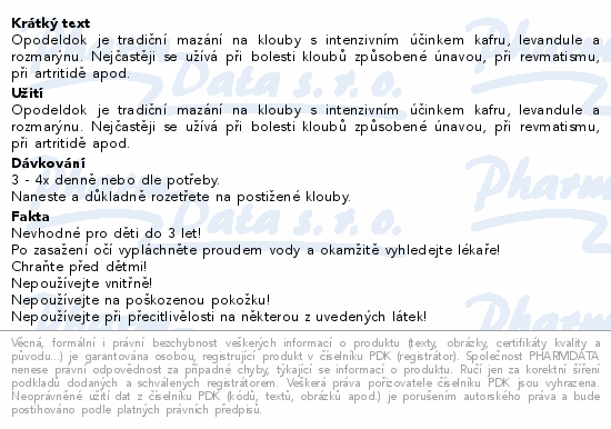 Opodeldok je tradiční mazání na klouby s intenzivním účinkem kafru, levandule a rozmarýnu. Nejčastěji se užívá při bolesti kloubů způsobené únavou, při revmatismu, při artritidě apod.