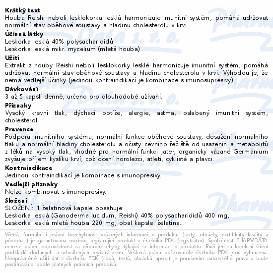 Houba Reishi neboli lesklokorka lesklá harmonizuje imunitní systém, pomáhá udržovat normální stav oběhové soustavy a hladinu cholesterolu v krvi.