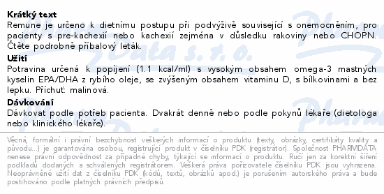 Remune je nutriční výživa, díky níž doplníte běžné jídlo o důležité živiny, jako jsou omega-3 mastné kyseliny z kvalitního rybího oleje, vitamin D nebo snadno stravitelné bílkoviny. Základ Remune, oproti běžným nutričním nápojům, tvoří ovocná šťáva. Právě skvělou chuť ocení zejména ti, kdo výživu ve formě nápoje konzumují pravidelně. Remune je určen k dietnímu postupu při podvýživě související s onemocněním. Pro pacienty s pre-kachexií nebo kachexií, zejména v důsledku rakoviny nebo chronické obstrukční plicní nemoci. Potravina pro zvláštní výživu. Potravina pro zvláštní lékařské účely. Co najdete v Remune • Vysoký obsah OMEGA-3 mastných kyselin • Vysoký obsah vitaminu D • Syrovátkovou bílkovinu • 86 % ovocné složky Rybí olej, zdroj OMEGA-3 mastných kyselin, pochází z jater tresek volně žijících v čistých norských vodách, jeho chuť však v Remune cítit nejde. Kdy Remune užívat? • K obohacení jídelníčku o omega-3 mastné kyseliny, vitamin D a snadno stravitelné bílkoviny, • při neschopnosti přijímat či trávit běžné potraviny, • v případě ohrožení podvýživou (např. senioři), • při celkové fyzické slabosti, nechtěné ztrátě hmotnosti a svalové hmoty v důsledku onemocnění (pre-kachexie, kachexie), • během přípravy na operaci i ve fázi rekonvalescence, • nemůžete-li krátkodobě konzumovat tuhou stravu (např. po stomatologickém zákroku), • jste-li onkologický pacient. Dávkování Odvíjí se od potřeb pacienta. Dvakrát denně nebo podle pokynů lékaře či dietologa. Nápoj vychlaďte dle chuti a před vypitím protřepejte. Vypijte jej najednou nebo popíjejte po částech v průběhu dne, pomocí přibaleného brčka nebo klasicky ze sklenice. Spotřebujte do 24 hodin od otevření. Kompletní složení | Příchuť malinová Potravina určená k popíjení (1.1 kcal/ml) s vysokým obsahem omega-3 mastných kyselin EPA/DHA z rybího oleje, se zvýšeným obsahem vitaminu D, s bílkovinami a bez lepku. Určeno k dietnímu postupu při podvýživě související s onemocněním, pro pacienty s pre-kachexií nebo kachexií zejména v důsledku rakoviny nebo CHOPN. Důležité upozornění: Není určeno pro parenterální použití! Užívat jen pod lékařským dohledem. Nevhodné jako jediný zdroj výživy. Nevhodné pro děti do 4 let. Návod k použití: Před použitím dobře protřepat. Dávkovat podle potřeb pacienta: 2 balení denně nebo podle pokynů lékaře (dietologa nebo klinického lékaře). Uchovávejte na suchém místě při teplotě 1- 25 °C. Chraňte před přímým slunečním světlem. Otevřenou lahvičku je možno uchovat v lednici a spotřebovat během 24 hod. Podávejte nejlépe chlazené. Složení: Ovocná šťáva z koncentrátu 86 % (jablko, hruška, granátové jablko, aronie), syrovátková bílkovina, rybí olej, stabilizátor: pektin, aroma, regulátor kyselosti: kyselina jablečná, antioxidant: extract bohatý na tokoferol, vitamin D. Distributor: B. Braun Medical s.r.o., V Parku 2335/20, CZ-148 00, Praha 4 Výživové údaje na 100 ml Energetická hodnota: 463 kJ / 111 kcal, Tuky 5,6 g (z toho nasycené mastné kyseliny 1,2 g, mononenasycené mastné kyseliny 2,3 g a polynenasycené mastné kyseliny 1,4 g [z toho omega-3-mastné kyseliny 1,2 g, EPA 0,40 g, DHA 0,60 g)], Sacharidy 10 g (z toho cukry 10 g - laktóza < 0,1 g), Vláknina 0,5 g, Bílkoviny 4,8 g, Sůl 0,03 g. Minerály na 100 ml: Na 13 mg, K 120 mg, Ca 28 mg, Mg 8,6 g, P 43 mg, Cl 50 mg, Zn 0,1 mg, Cu 22 mcg, I 30 mcg, Mn 0,05 mg, Mo 17 mcg, Se 5 mcg. Vitaminy na 100 ml: Vitamin A (RE) 60 mcg, Vitamin D 5 mcg, Vitamin E (alfa-TE) 2,1 mg, Vitamin B12 0,8 mcg, Kyselina listová 20 mcg, Kyselina pantothenová 0,05 mg. Poměr energie: Bílkoviny 17 %, Tuky 46 %, Sacharidy 36 %, Vláknina 1 %. Osmolarita 698 mosm / l, Voda 81 ml / 100 ml.