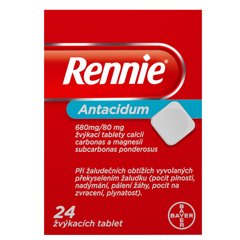 Rennie žvýkací tablety jsou léčivým přípravkem, který chrání sliznici žaludku a tenkého střeva tím, že působí proti překyselení žaludeční šťávy. Neutralizují přebytečné žaludeční kyseliny a obnovují normální rovnováhu ve složení žaludeční šťávy. Tak jsou žaludeční a střevní sliznice chráněny proti škodlivým vlivům. Jelikož jsou žvýkací tablety dobře rozpustné, nastupují účinky přípravku rychle. Přípravek se užívá při překyselení žaludku a tím vyvolaných žaludečních obtížích (pálení žáhy, pocit plnosti, nadýmání, pocit na zvracení, zvracení, plynatost).