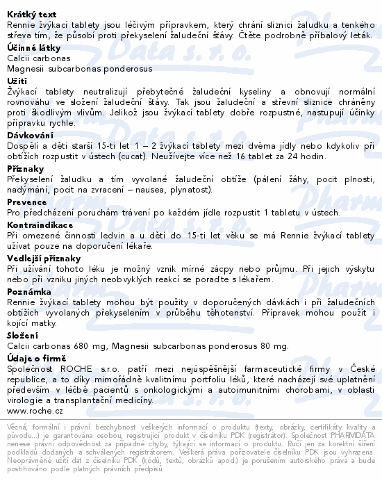 Rennie žvýkací tablety jsou léčivým přípravkem, který chrání sliznici žaludku a tenkého střeva tím, že působí proti překyselení žaludeční šťávy. Čtěte pozorně příbalový leták.