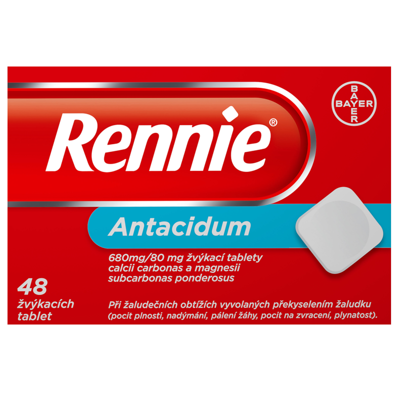 Rennie žvýkací tablety jsou léčivým přípravkem, který chrání sliznici žaludku a tenkého střeva tím, že působí proti překyselení žaludeční šťávy. Neutralizují přebytečné žaludeční kyseliny a obnovují normální rovnováhu ve složení žaludeční šťávy. Tak jsou žaludeční a střevní sliznice chráněny proti škodlivým vlivům. Jelikož jsou žvýkací tablety dobře rozpustné, nastupují účinky přípravku rychle. Přípravek se užívá při překyselení žaludku a tím vyvolaných žaludečních obtížích (pálení žáhy, pocit plnosti, nadýmání, pocit na zvracení, zvracení, plynatost).