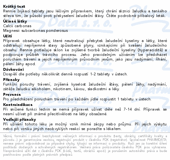 Rennie žvýkací tablety jsou léčivým přípravkem, který chrání sliznici žaludku a tenkého střeva tím, že působí proti překyselení žaludeční šťávy. Neutralizují přebytečné žaludeční kyseliny a obnovují normální rovnováhu ve složení žaludeční šťávy. Tak jsou žaludeční a střevní sliznice chráněny proti škodlivým vlivům. Jelikož jsou žvýkací tablety dobře rozpustné, nastupují účinky přípravku rychle. Přípravek se užívá při překyselení žaludku a tím vyvolaných žaludečních obtížích (pálení žáhy, pocit plnosti, nadýmání, pocit na zvracení, zvracení, plynatost).