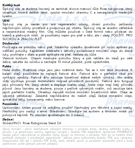 Šípkový olej za studena lisovaný ze semínek divoce rostoucí růže Rosa rubiginosa, který obsahuje, kromě dalších látek, vysoké množství vitamínu C a nenasycených mastných kyselin.