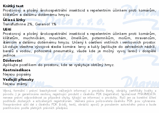 Prostorový a plošný širokospektrální insekticid s repelentním účinkem proti komárům, klíšťatům a dalšímu dotěrnému hmyzu.