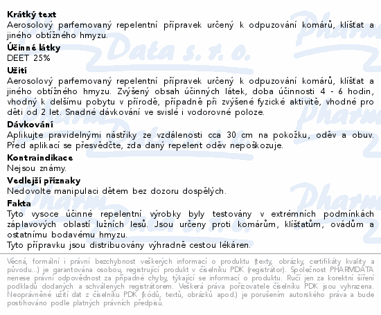 Aerosolový parfemovaný repelentní přípravek určený k odpuzování komárů, klíšťat a jiného obtížného hmyzu.