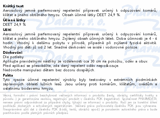 Aerosolový jemně parfemovaný repelentní přípravek určený k odpuzování komárů, klíšťat a jiného obtížného hmyzu. Obsah účinné látky DEET 24,9 %.