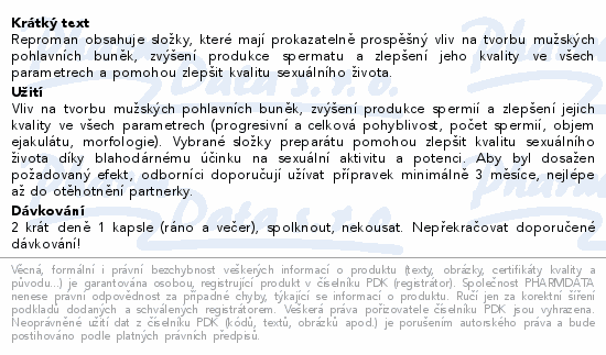 Reproman obsahuje složky, které mají prokazatelně prospěšný vliv na tvorbu mužských pohlavních buněk, zvýšení produkce spermatu a zlepšení jeho kvality ve všech parametrech a pomohou zlepšit kvalitu sexuálního života.