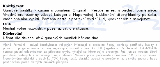 Gumové pastilky k cucání s obsahem Originální Rescue směsi, s příchutí pomeranče. Vhodné pro všechny věkové kategorie. Napomáhají k uklidnění citové hladiny po šoku, emocionálním vypětí. Pomáhá nastolit pozitivní vnitřní klid, vyrovnanost a sebejistotu.