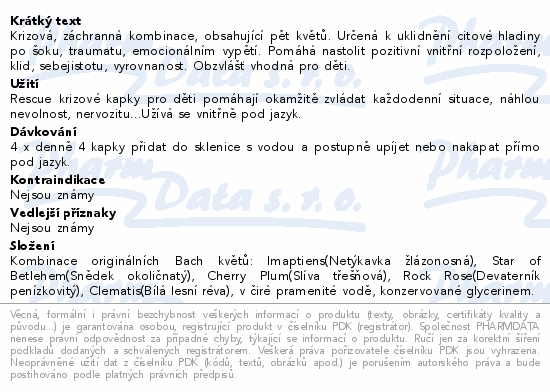 Krizová, záchranná kombinace, obsahující pět květů. Určená k uklidnění citové hladiny po šoku, traumatu, emocionálním vypětí. Pomáhá nastolit pozitivní vnitřní rozpoložení, klid, sebejistotu, vyrovnanost. Obzvlášť vhodná pro děti.
