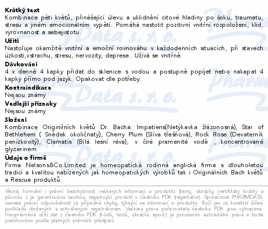 Kombinace pěti květů, přinášející úlevu a uklidnění citové hladiny po šoku, traumatu, stresu a jiném emocionálním vypětí. Pomáhá nastolit pozitivní vnitřní rozpoložení, klid, vyrovnanost a sebejistotu.