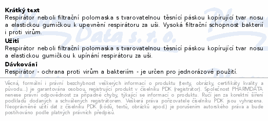 Respirátor neboli filtrační polomaska s tvarovatelnou těsnící páskou kopírující tvar nosu a elastickou gumičkou k upevnění respirátoru za uši. Vysoká filtrační schopnost bakterií i proti virům.