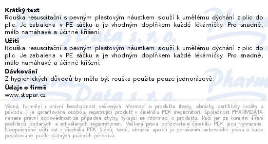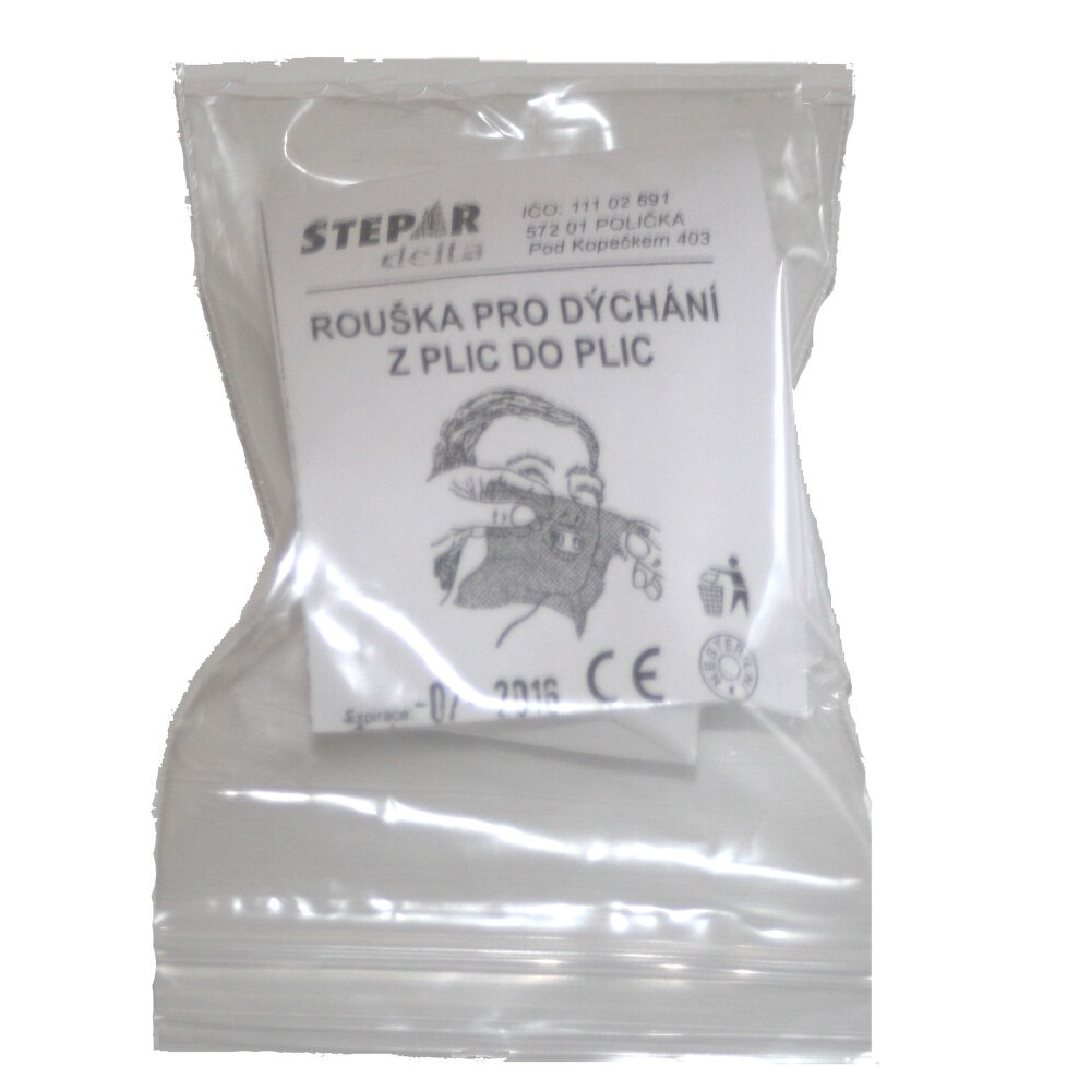 Rouška resuscitační s pevným plastovým náustkem slouží k umělému dýchání z plic do plic. Je zabalena v PE sáčku a je vhodným doplňkem každé lékárničky. Pro snadné, málo namáhavé a účinné kříšení.