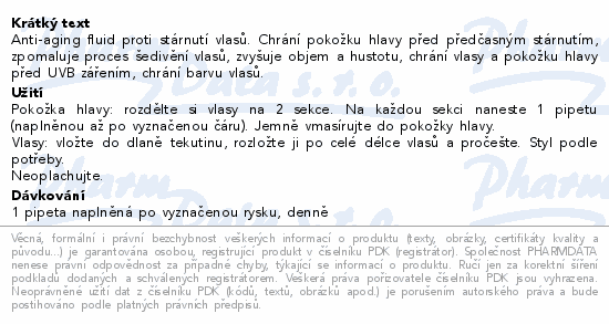 Anti-aging fluid proti stárnutí vlasů. Chrání pokožku hlavy před předčasným stárnutím, zpomaluje proces šedivění vlasů, zvyšuje objem a hustotu, chrání vlasy a pokožku hlavy před UVB zářením, chrání barvu vlasů.