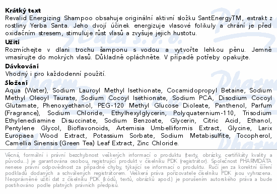 Revalid Energizing Shampoo obsahuje originální aktivní složku SantEnergyTM, extrakt z rostliny Yerba Santa. Jeho dvojí účinek energizuje vlasové folikuly a chrání je před oxidačním stresem, stimuluje růst vlasů a zvyšuje jejich hustotu.