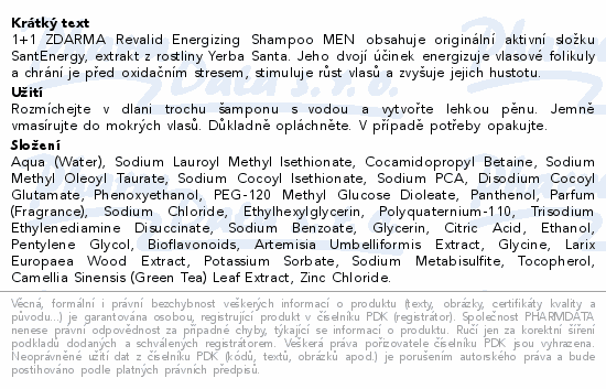1+1 ZDARMA Revalid Energizing Shampoo MEN obsahuje originální aktivní složku SantEnergy, extrakt z rostliny Yerba Santa. Jeho dvojí účinek energizuje vlasové folikuly a chrání je před oxidačním stresem, stimuluje růst vlasů a zvyšuje jejich hustotu.