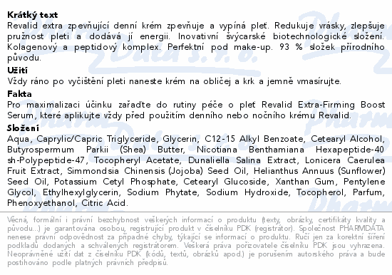 Revalid extra zpevňující denní krém zpevňuje a vypíná pleť. Redukuje vrásky, zlepšuje pružnost pleti a dodává jí energii. Inovativní švýcarské biotechnologické složení. Kolagenový a peptidový komplex. Perfektní pod make-up. 93 % složek přírodního původu.