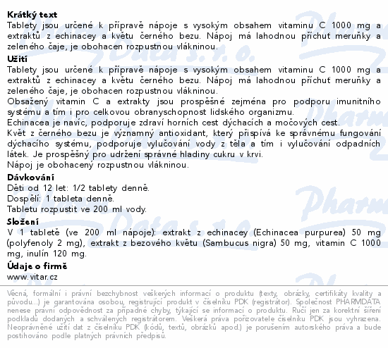 Tablety jsou určené k přípravě nápoje s vysokým obsahem vitaminu C 1000 mg a extraktů z echinacey a květu černého bezu. Nápoj má lahodnou příchuť meruňky a zeleného čaje, je obohacen rozpustnou vlákninou.