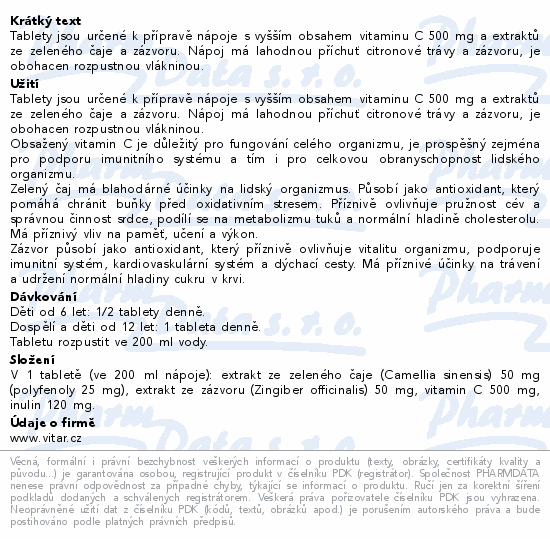 Tablety jsou určené k přípravě nápoje s vyšším obsahem vitaminu C 500 mg a extraktů ze zeleného čaje a zázvoru. Nápoj má lahodnou příchuť citronové trávy a zázvoru, je obohacen rozpustnou vlákninou.