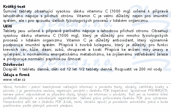 Šumivé tablety obsahující vysokou dávku vitaminu C (1000 mg) určené k přípravě lahodného nápoje s příchutí citrónu. Vitamin C je velmi důležitý nejen pro imunitní systém, ale i pro spoustu dalších fyziologických procesů v lidském organizmu.