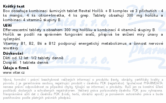 Box obsahuje kombinaci šumivých tablet Revital Hořčík + B komplex ve 3 příchutích - 4 ks mango, 4 ks citron+limetka, 4 ks grep. Tablety obsahují 300 mg hořčíku a kombinaci 4 vitaminů skupiny B.