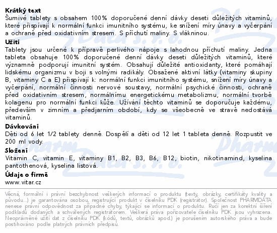 Šumivé tablety s obsahem 100% doporučené denní dávky deseti důležitých vitaminů, které přispívají k normální funkci imunitního systému, ke snížení míry únavy a vyčerpání a ochraně před oxidativním stresem. S příchutí maliny. S vlákninou.