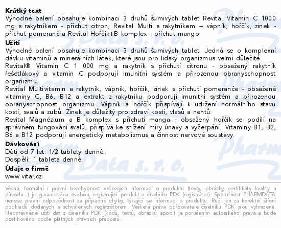 Výhodné balení obsahuje kombinaci 3 druhů šumivých tablet Revital Vitamin C 1000 mg s rakytníkem - příchuť citron, Revital Multi s rakytníkem + vápník, hořčík, zinek - příchuť pomeranč a Revital Hořčík+B komplex - příchuť mango.