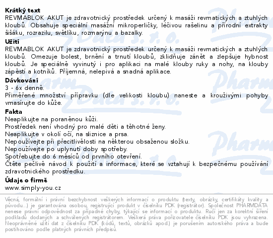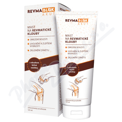 REVMABLOK AKUT je zdravotnický prostředek určený k masáži revmatických a ztuhlých kloubů. Obsahuje speciální masážní mikroperličky, léčivou rašelinu a přírodní extrakty šišáku, rozrazilu, světlíku, rozmarýnu a bazalky.