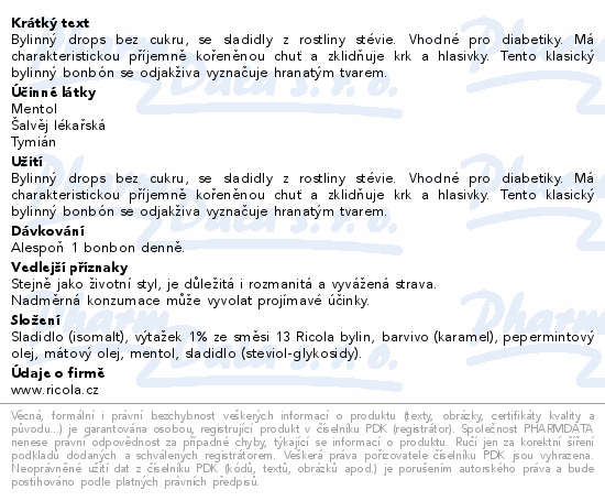 Bylinný drops bez cukru, se sladidly z rostliny stévie. Vhodné pro diabetiky. Má charakteristickou příjemně kořeněnou chuť a zklidňuje krk a hlasivky. Tento klasický bylinný bonbón se odjakživa vyznačuje hranatým tvarem.